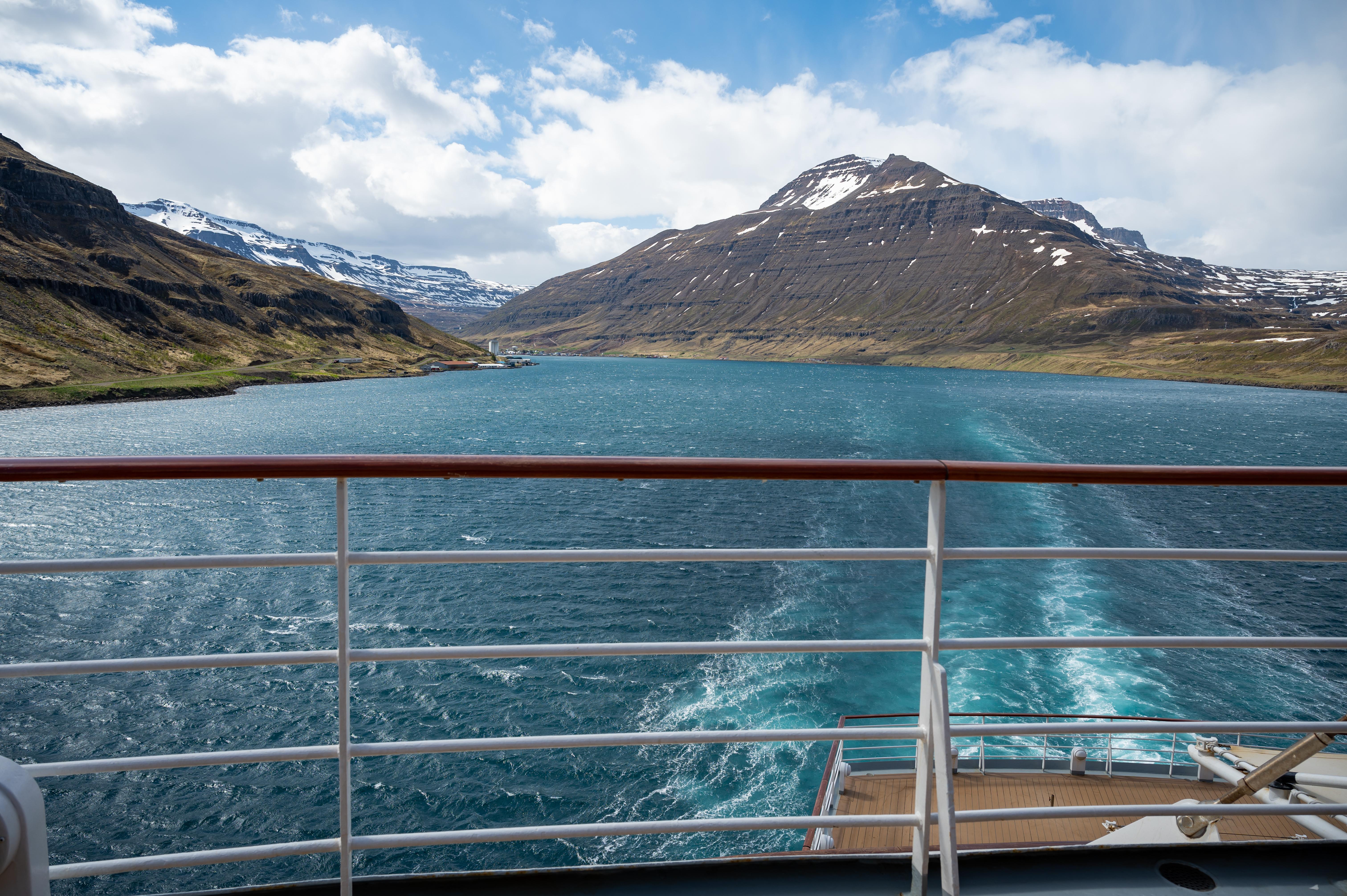 - Chegada ao porto de Seyðisfjörður, uma das vilas mais encantadoras da Islândia, rodeada por montanhas e cascatas. Situada no coração do leste islandês, esta pequena localidade destaca-se pela sua beleza natural e pelo ambiente tranquilo que a envolve. As casas de madeira multicoloridas, herança dos primeiros colonos, conferem-lhe um charme singular, enquanto a presença de espaços dedicados à arte e à memória coletiva revela o espírito criativo e resiliente da comunidade. A icónica igreja azul, Bláa Kirkjan, é um dos símbolos mais reconhecíveis da vila. Noite a bordo.