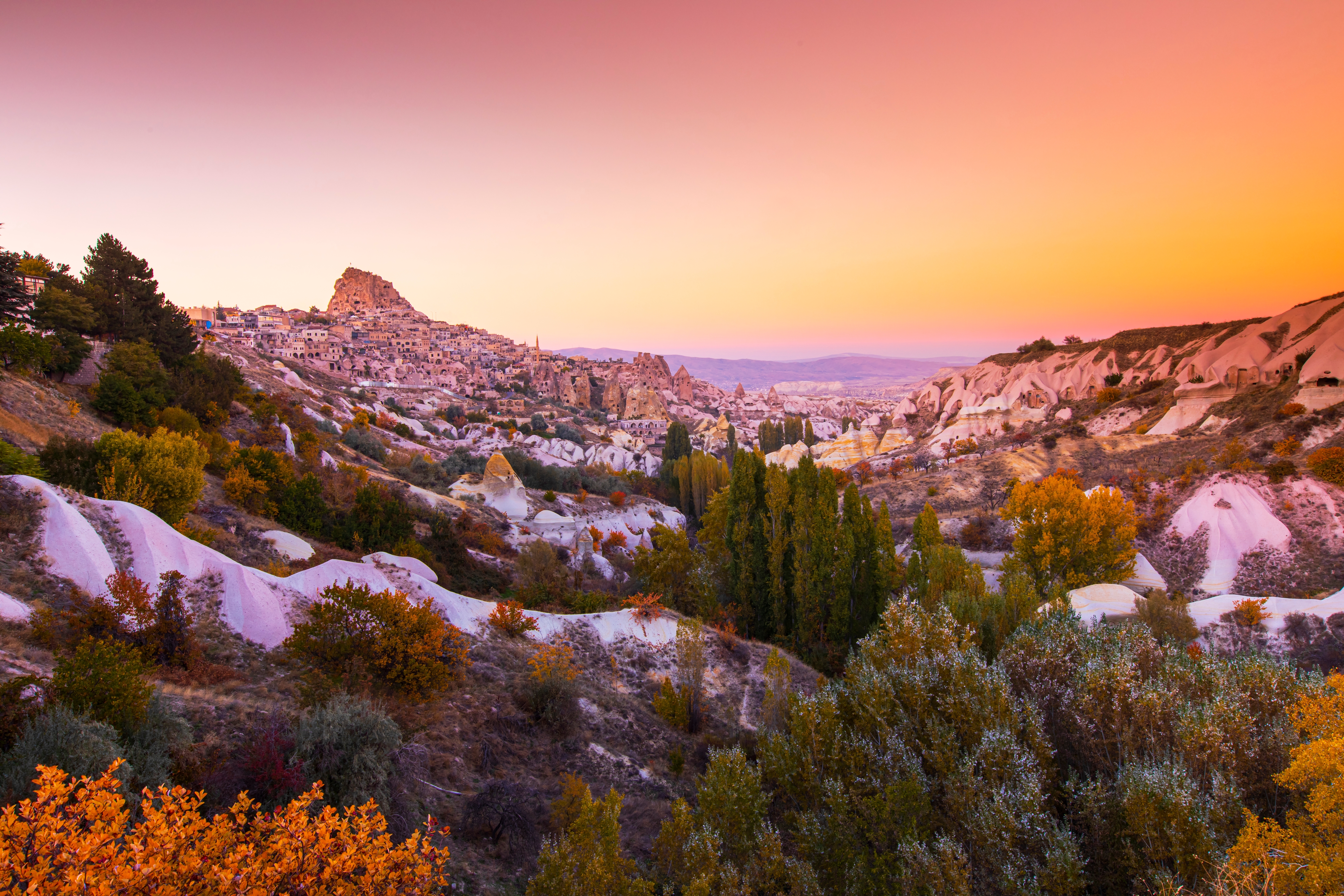 Pequeno-almoço. Saída para visitar esta fantástica região, onde nasceu São Jorge, com a sua fascinante e original paisagem, formada há 3 milhões de anos por lava expelida dos Vulcões Erciyes e Hasan. A visita começa com um percurso pelo Vale Dervent, conhecido como o Vale das Chaminés de Fadas, onde a erosão da pedra pelo vento e pela ação da água sobre o terreno vulcânico deu lugar a uma paisagem espetacular formada por picos, cones e obeliscos. De seguida, visita à cidade subterrânea de Ozkonak ou a outra similar construídas pelas comunidades Cristãs para se protegerem dos ataques árabes. Paragem numa oficina de tapetes e kilims. Continuação da viagem a Göreme, um museu ao ar livre, que conserva um impressionante conjunto de igrejas, mosteiros e capelas escavados nos rochedos e decorados com frescos do século XI, que foram declarados Património da Humanidade pela UNESCO. Pela tarde, panorâmica das espetaculares paisagens vulcânicas dos vales de Avcilar (dos caçadores) e de Güvercinlik (dos pombos) para admirar a maravilhosa vista panorâmica do castelo de Uchisar, situado no topo de um promontório de rocha vulcânica perfurado por túneis e janelas. No final, paragem numa oficina de artesanato de decoração, pedras típicas e jóias da Capadócia. Jantar e alojamento no hotel. Pela noite, opcionalmente, é possível assistir a um espectáculo de danças folclóricas turcas (não incluído).